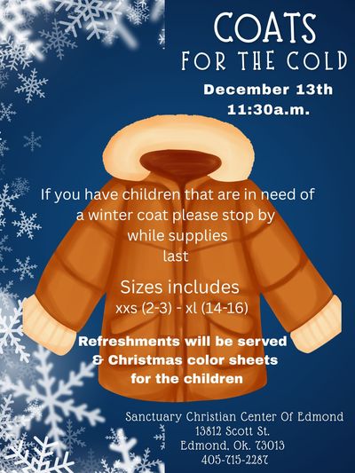 We are collecting coats for children that need them. Sizes range from toddler to early teens. We want to bless as many children as we possibly are able to. We will distribute the coats on Saturday, December 13 at the church located at 13812 Scott ST, Edmond OK 73013. If you would like to help us, please purchase a coat or coats and drop them by the church or call and we can arrange a pick up at your convenience. Bless you all!